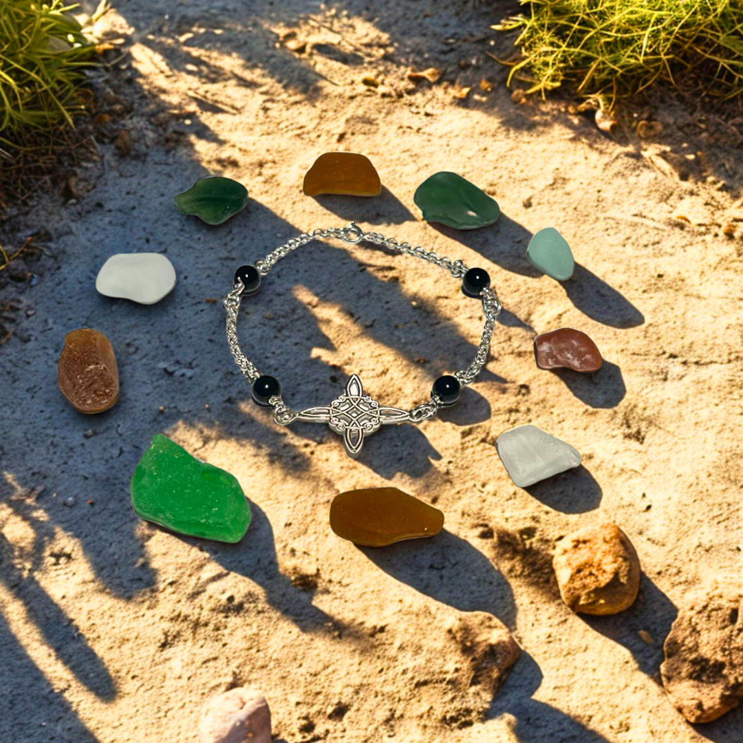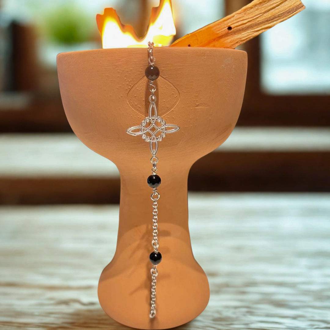 Esta pulsera está elaborada con piedras de azabache , reconocidas ancestralmente por absorber las malas energías y el mal de ojo. En el centro, el nudo de bruja simboliza unión, equilibrio y protección contra todo lo negativo.