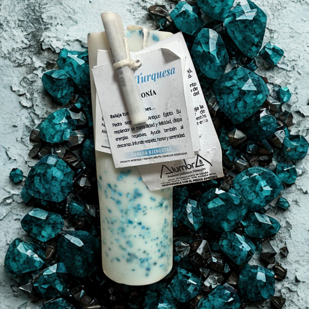 La Vela de Turquesa – Armonía & Bienestar integra fragmentos de turquesa, piedra asociada a la serenidad y la comunicación honesta desde la antigüedad. Su presencia ayuda a equilibrar emociones, suavizar la mente y crear un ambiente propicio para el descanso y la claridad. Ideal para espacios de meditación, dormitorio o estudio.
